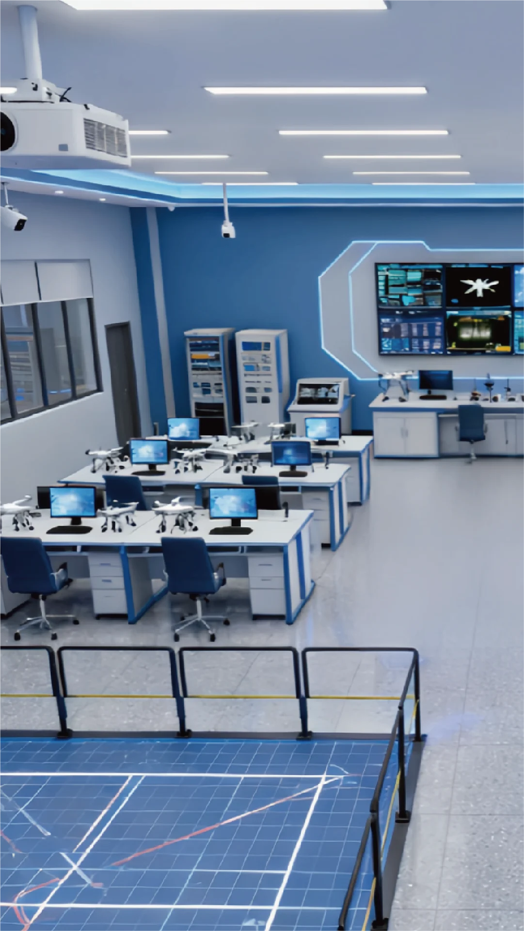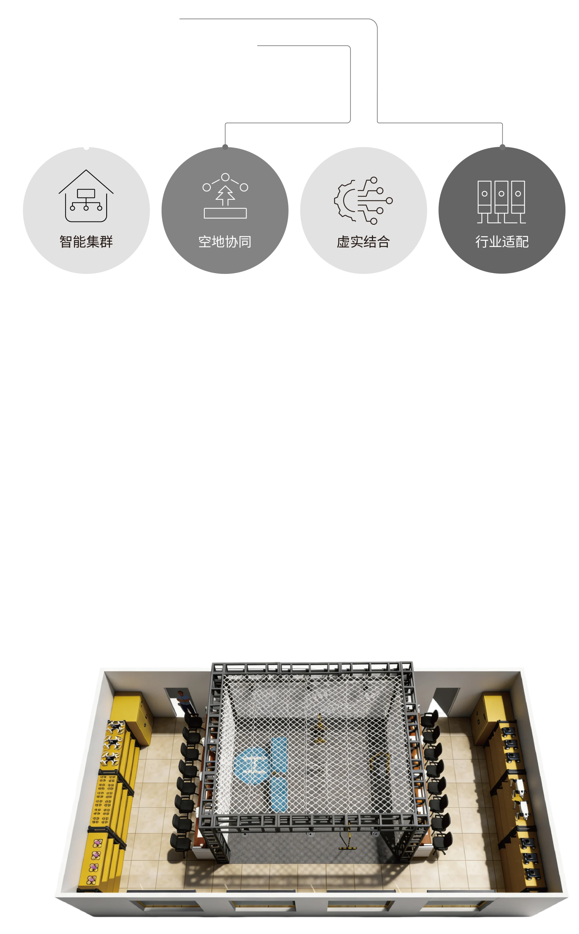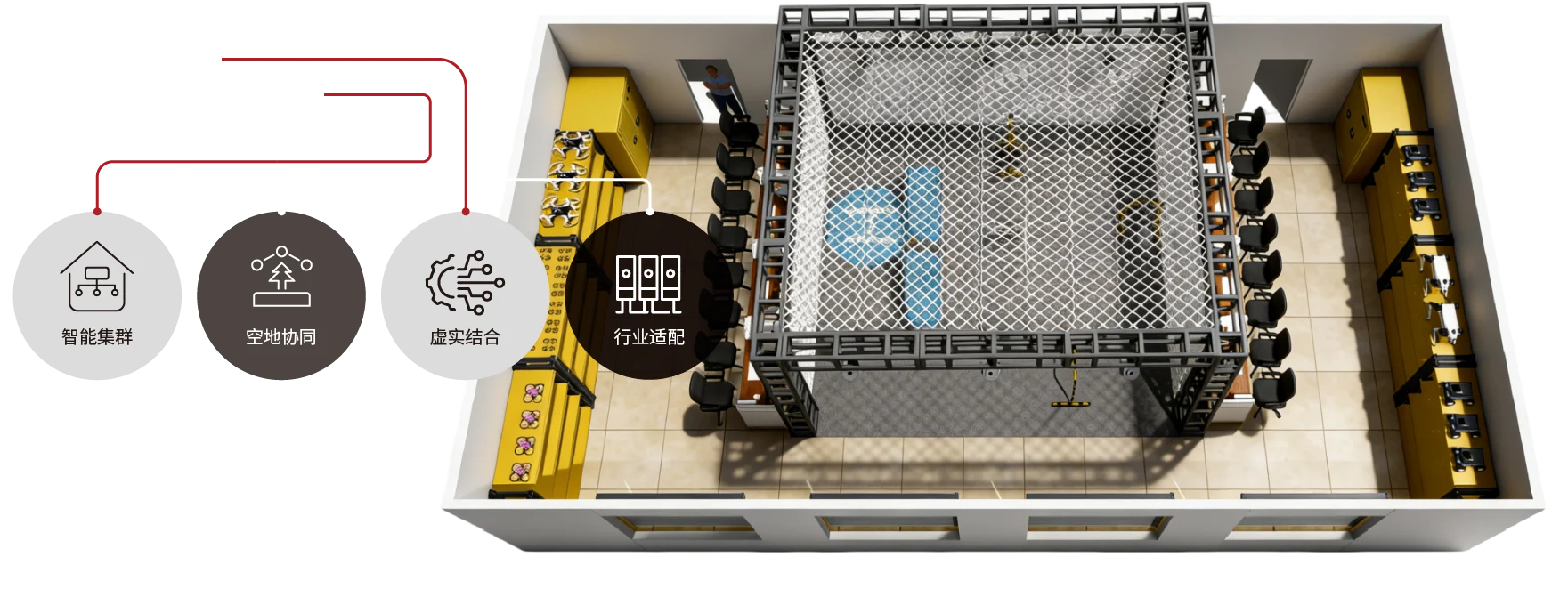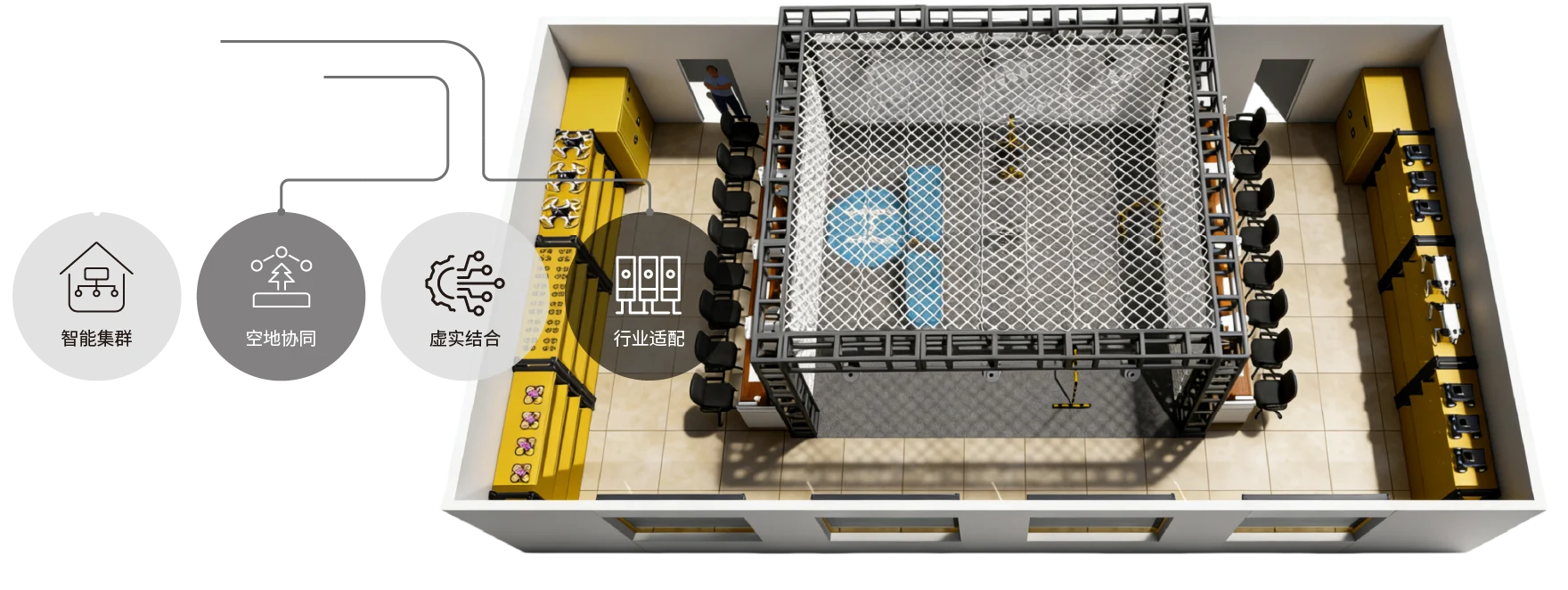主要应用于无人机等无人系统的多机集群仿真领域。仿真单元集成10套工业级自驾仪、网络交换、继电器等硬件设备,基于飞思RflySim平台构建了Linux+ROS与PX4联动的仿真环境,在仿真计算机上部署RflySim平台后,在RflySim3D中提供城市、山区等各类集群飞行环境,从而实现丰富的多机集群仿真。
