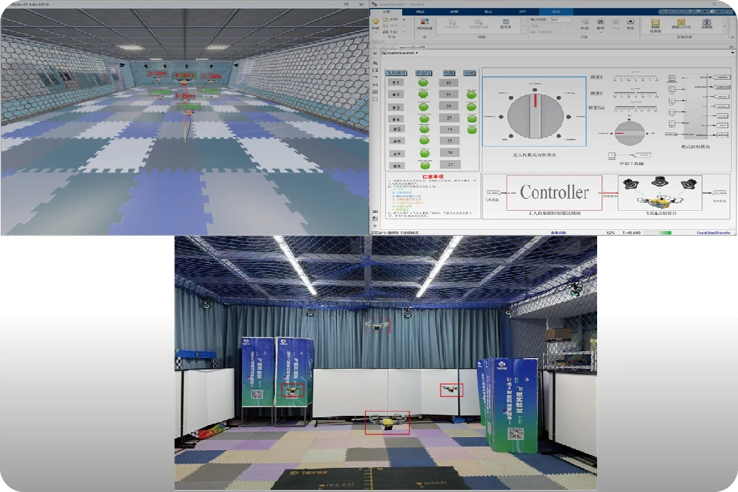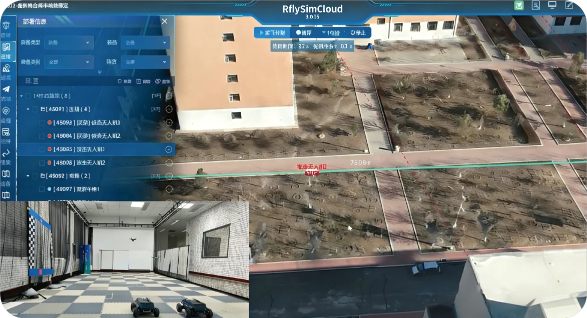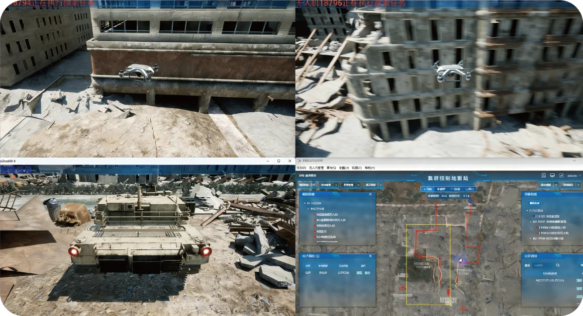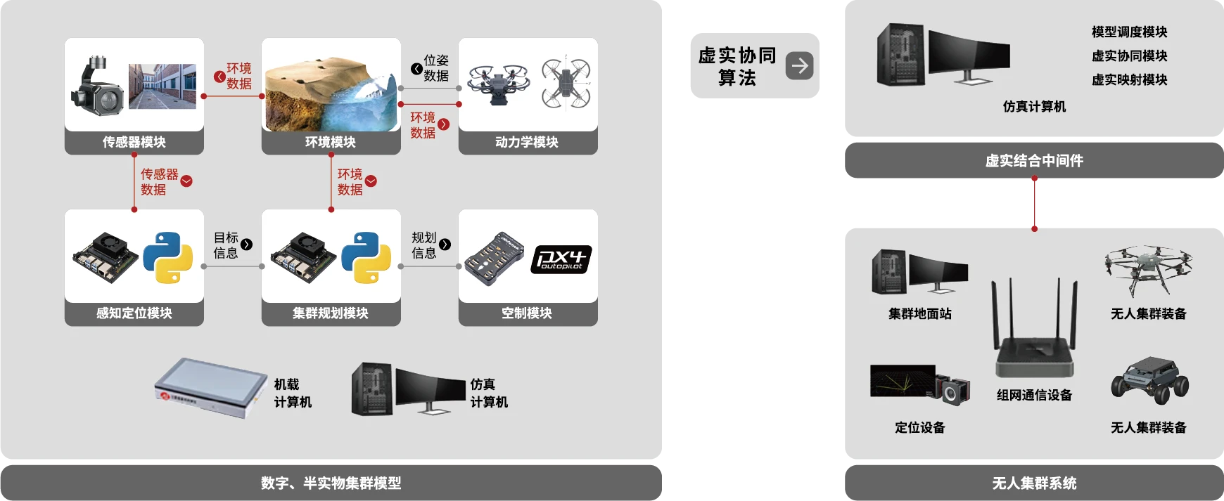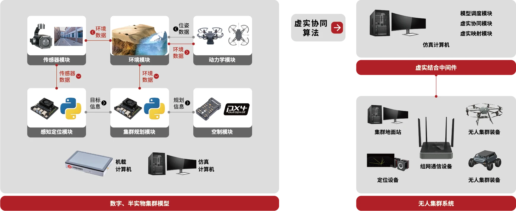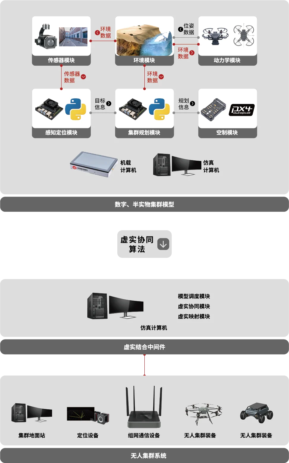 基于高保真环境仿真、 多源异构传感器仿真、无人集群仿真、行为活动仿真、硬件在环仿真和云仿真等核心工具链,搭建了一套包括数字、半实物模型和无人集群设备的虚实结合系统,为虚实结合协同算法研发与验证提供高效手段。