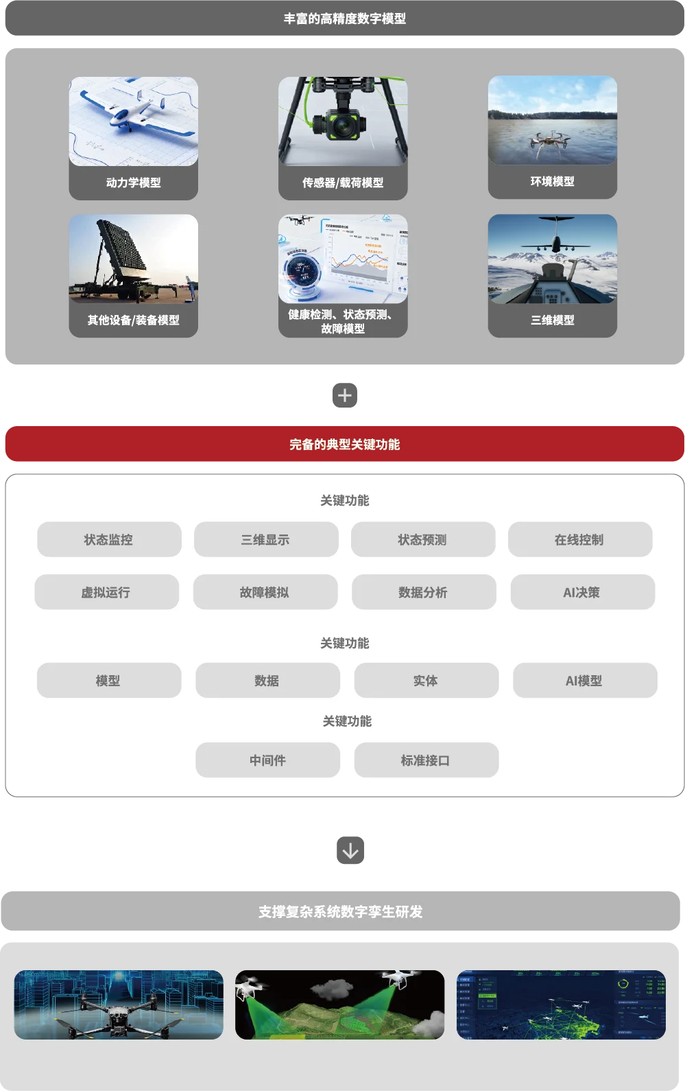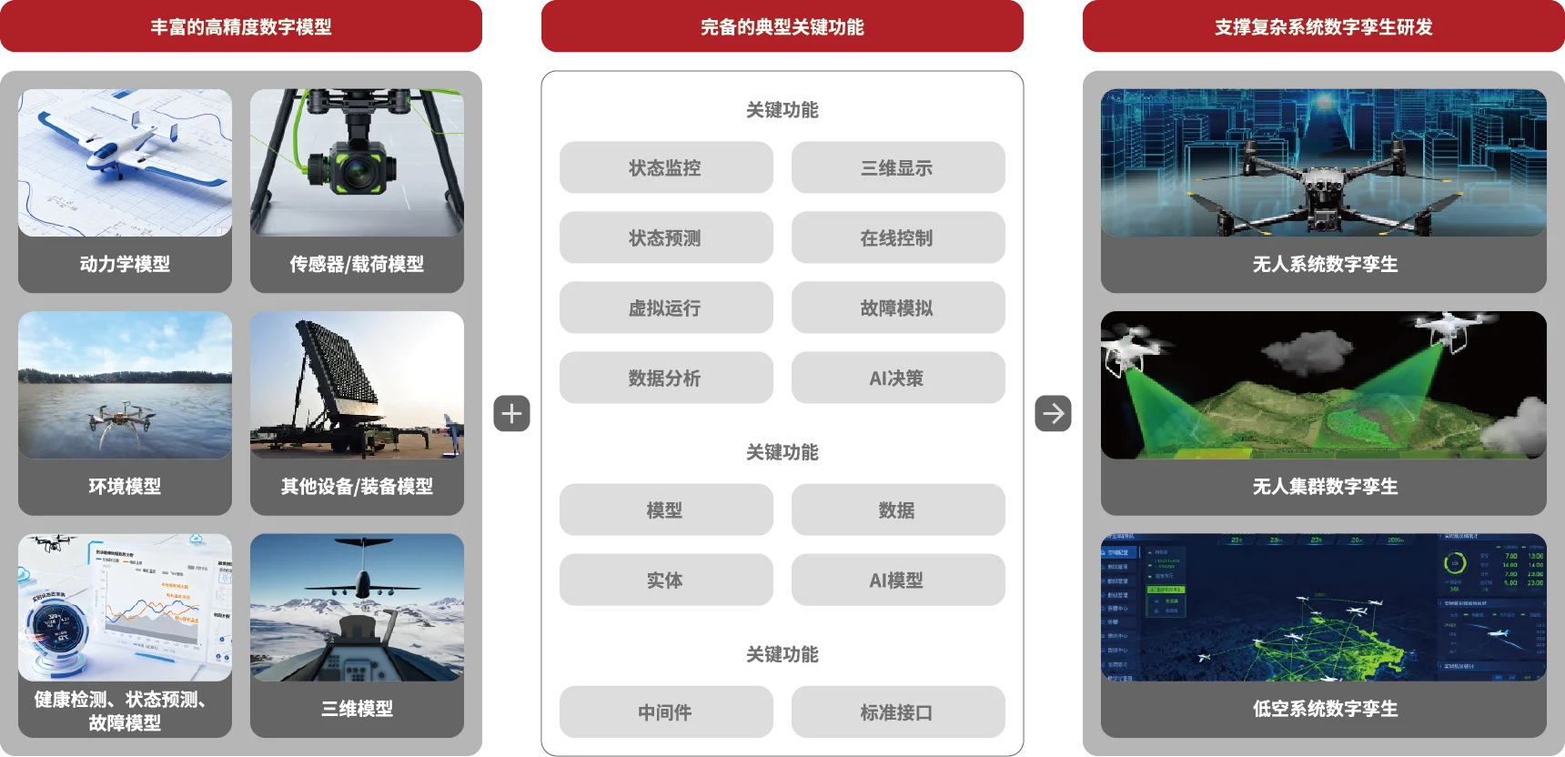 面向无人平台/集群等复杂系统的研发和运维等任务需求,基于高精度数字化模型和虚实双向交互技术,通过虚实映射、实时数据驱动、实时交互、预测分析、决策优化、模型演化、多学科集成、全生命周期管理等典型关键功能,支撑无人装备集群、工业机器人、低空系统等复杂系统的数字孪生系统研发。
