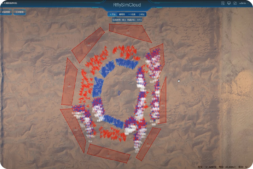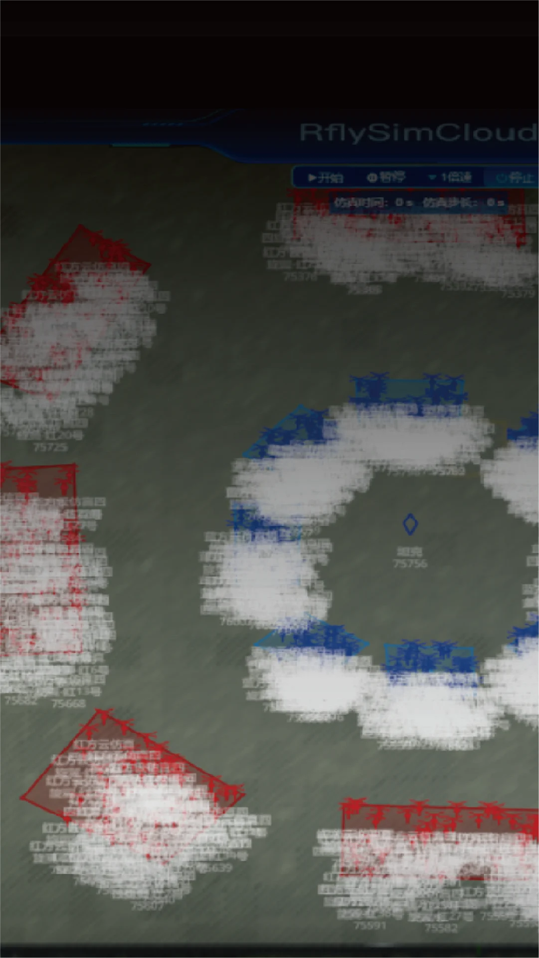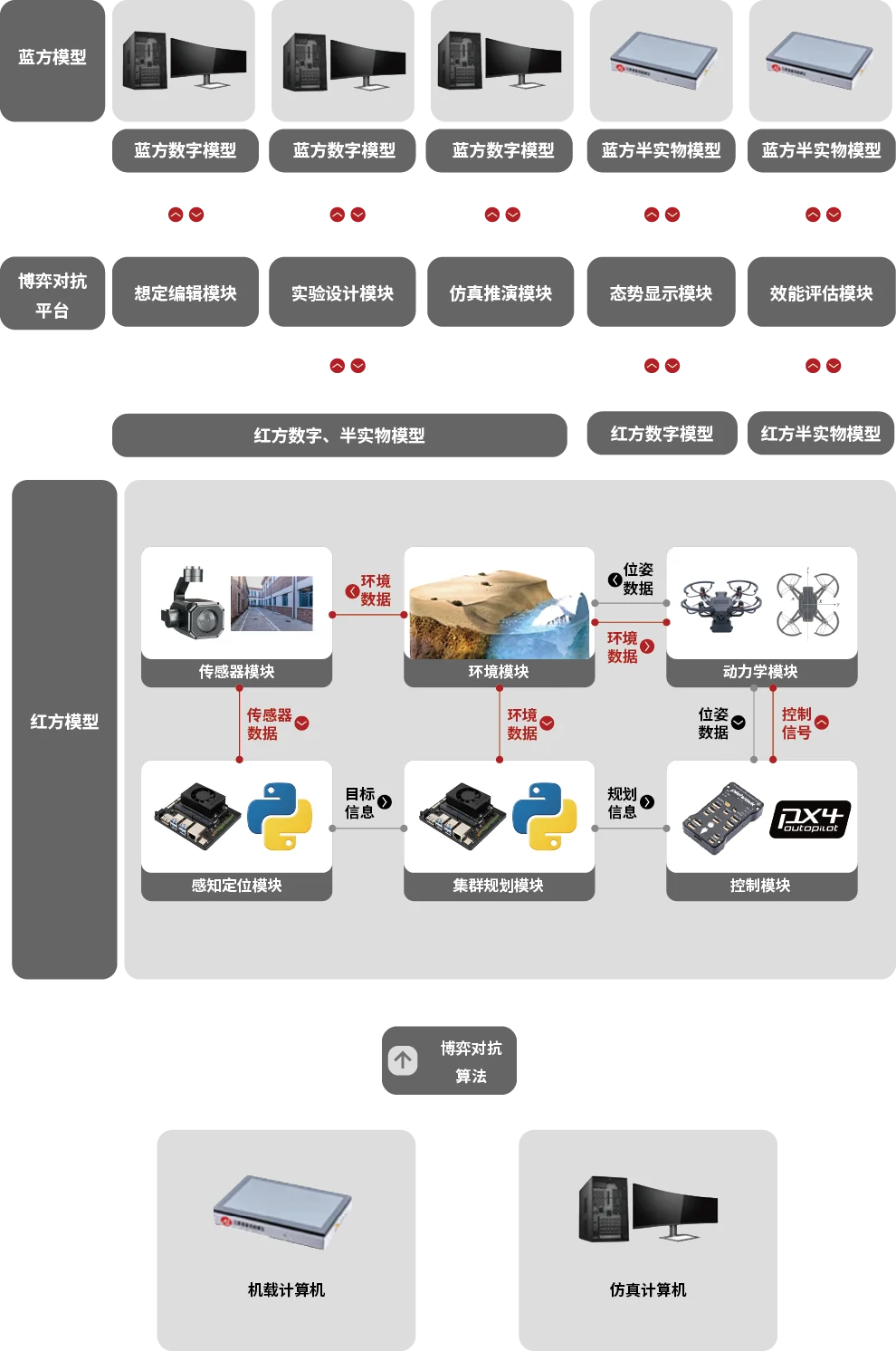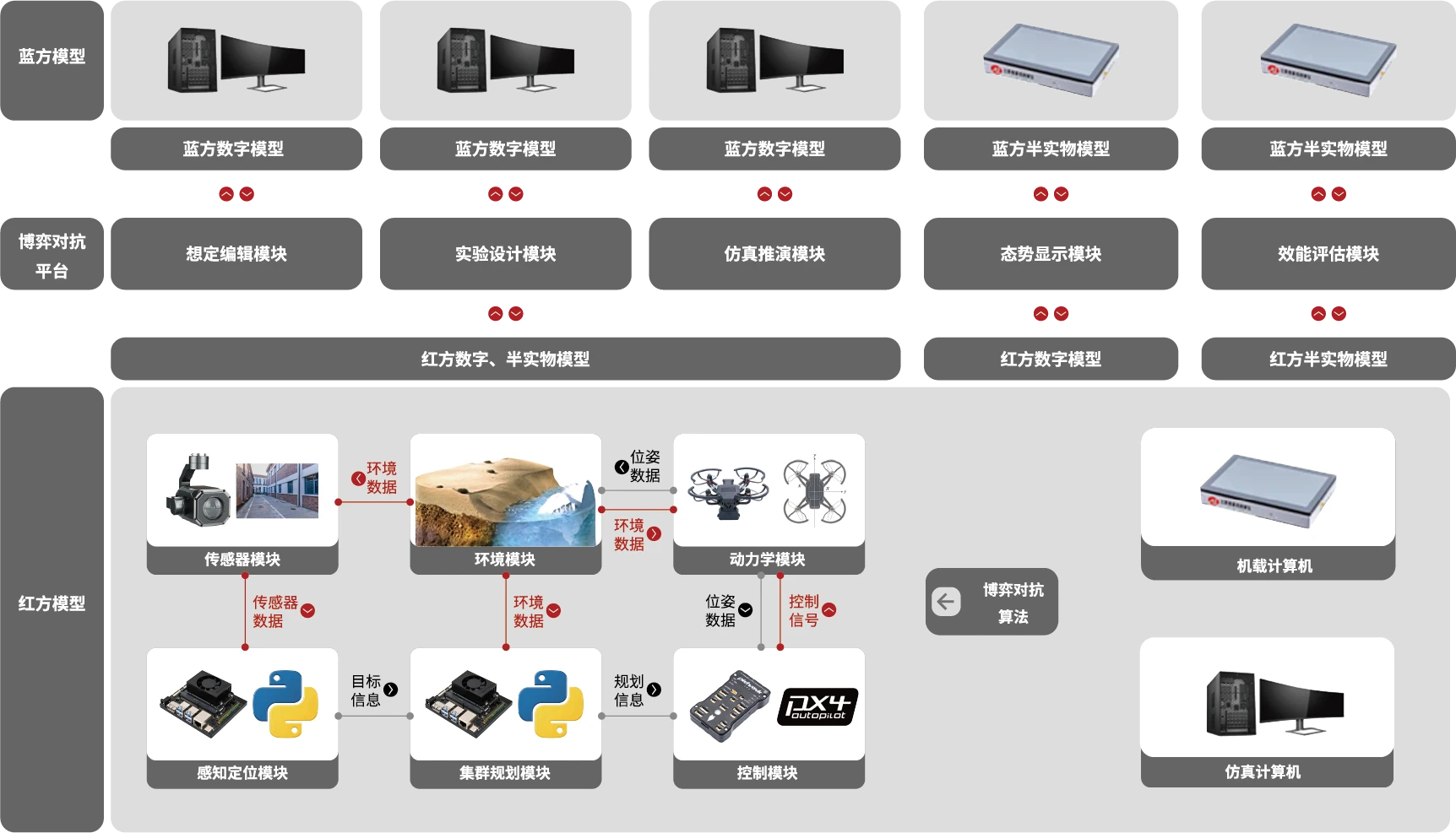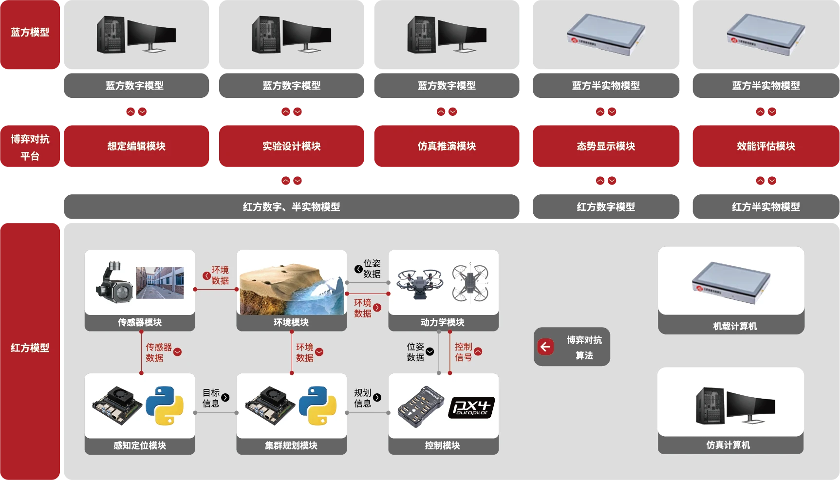 基于高保真环境仿真、 多源异构传感器仿真、无人集群仿真、行为活动仿真、日志仿真、硬件在环仿真、云仿真、数据资源管理器和验证工具集等核心工具链,构建了支撑红蓝双方博弈对抗的想定编辑、实验设计、仿真推演、态势显示和效能评估等功能模块,支撑博弈场景构建,博弈样本生成,博弈算法自动化推演和博弈结果评估及可视化,加速博弈对抗算法的研发与验证。