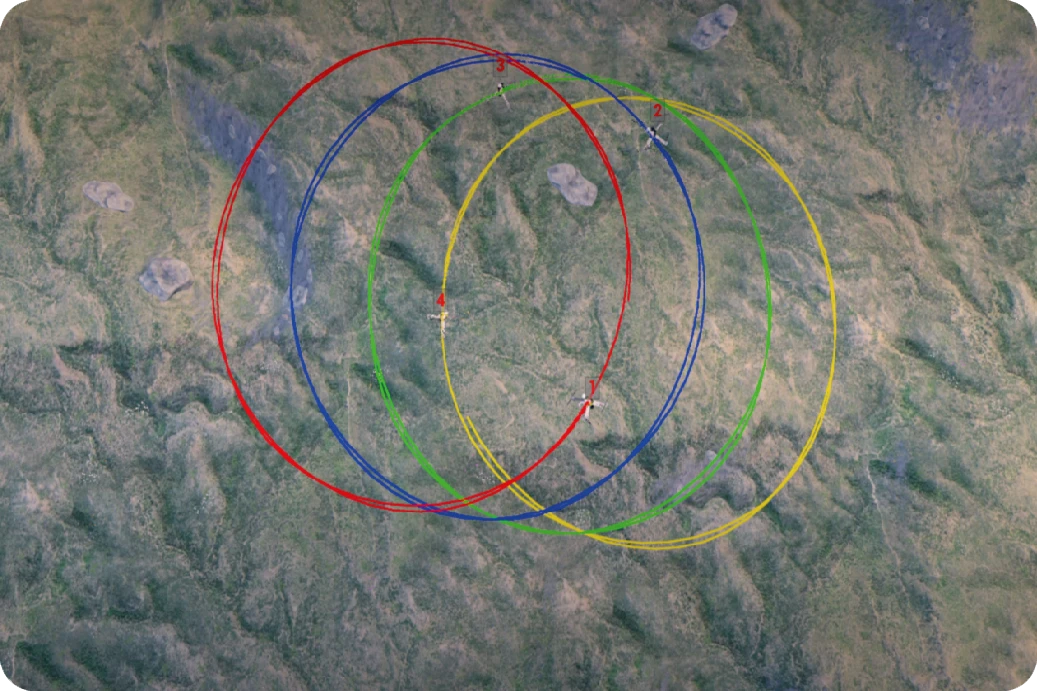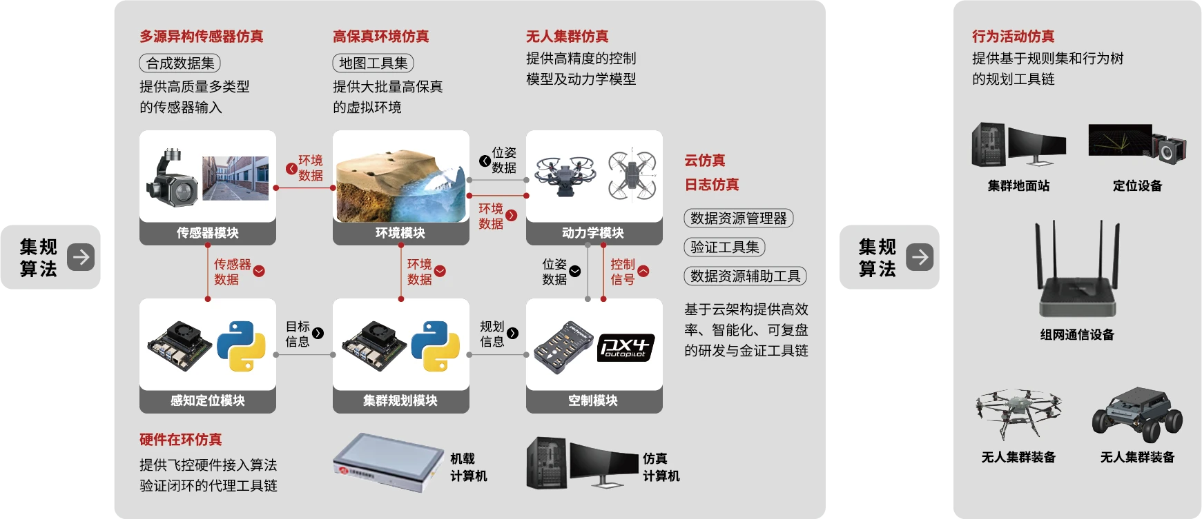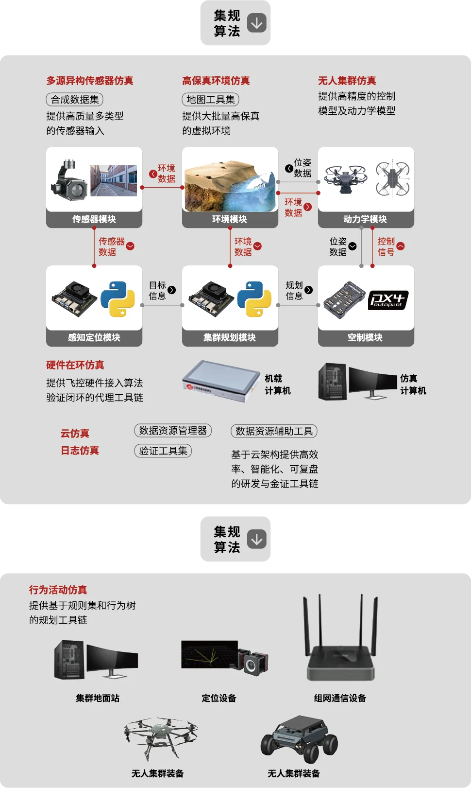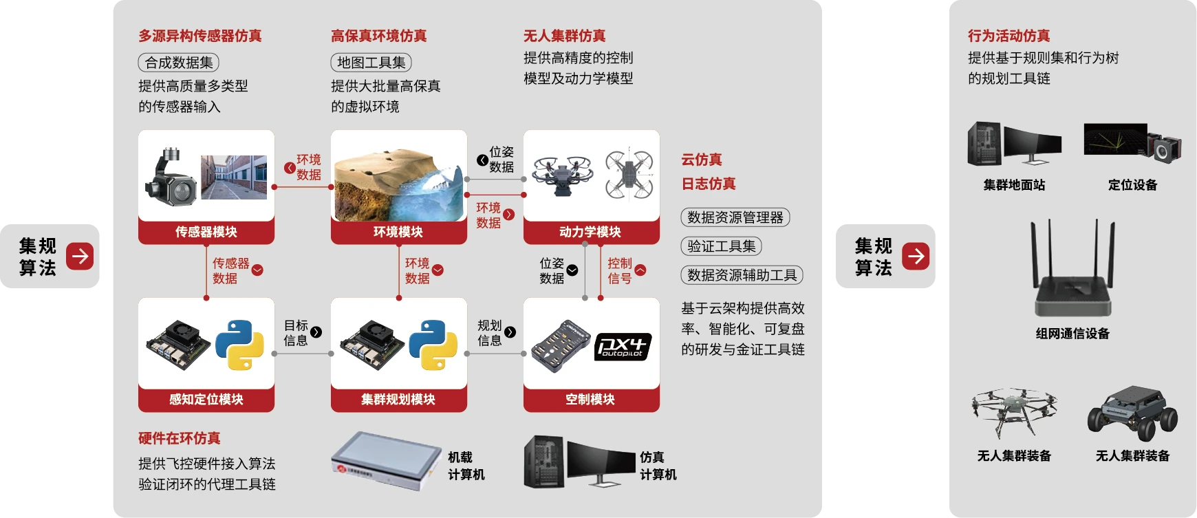 基于高保真环境仿真、 多源异构传感器仿真、无人集群仿真、行为活动仿真、硬件在环仿真和云架构引擎等核心工具链,搭建了包括地面站、定位设备、通信设备和无人集群装备在内的集群系统,为集群规划算法研发与验证提供软硬件支撑环境。