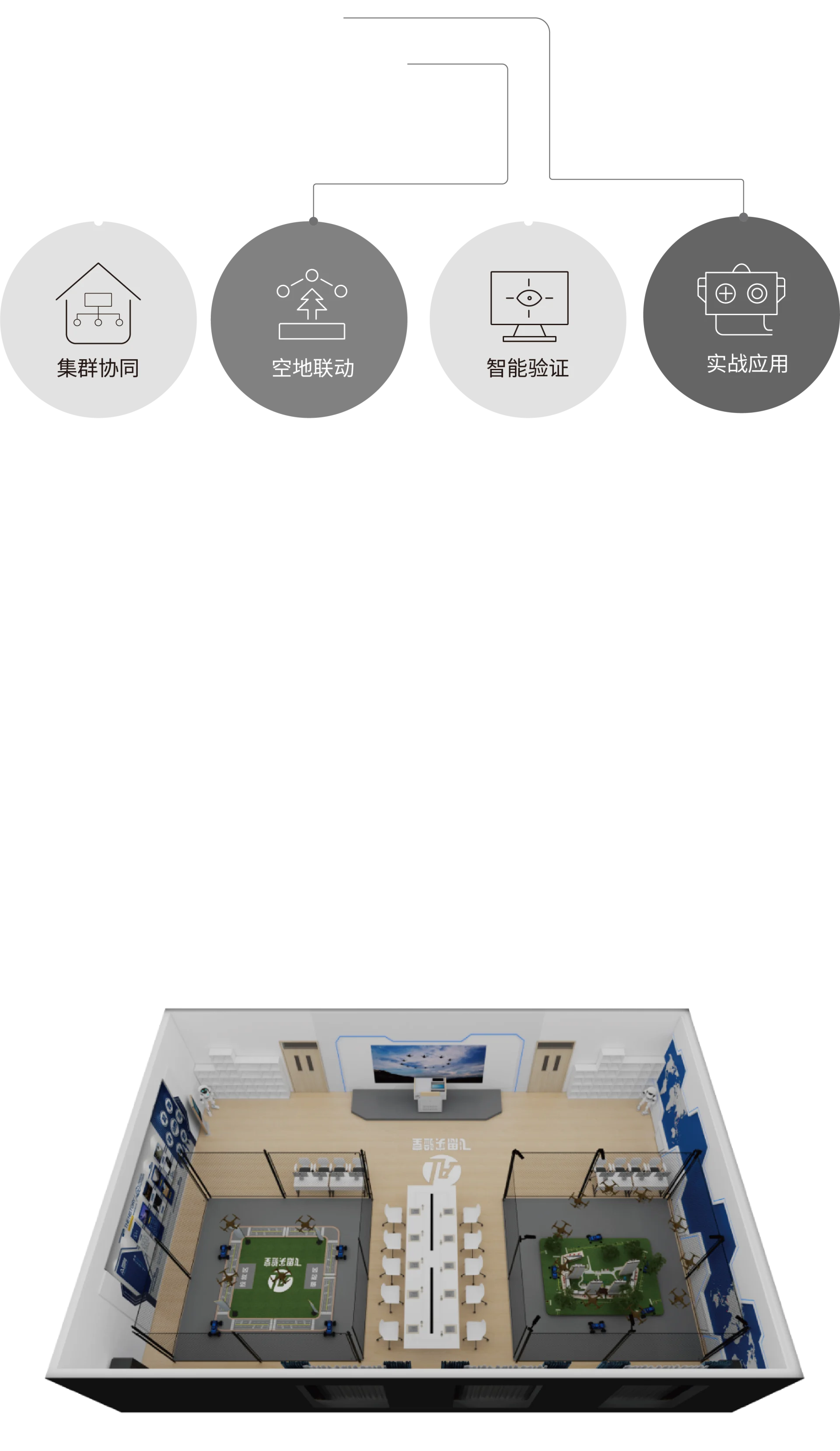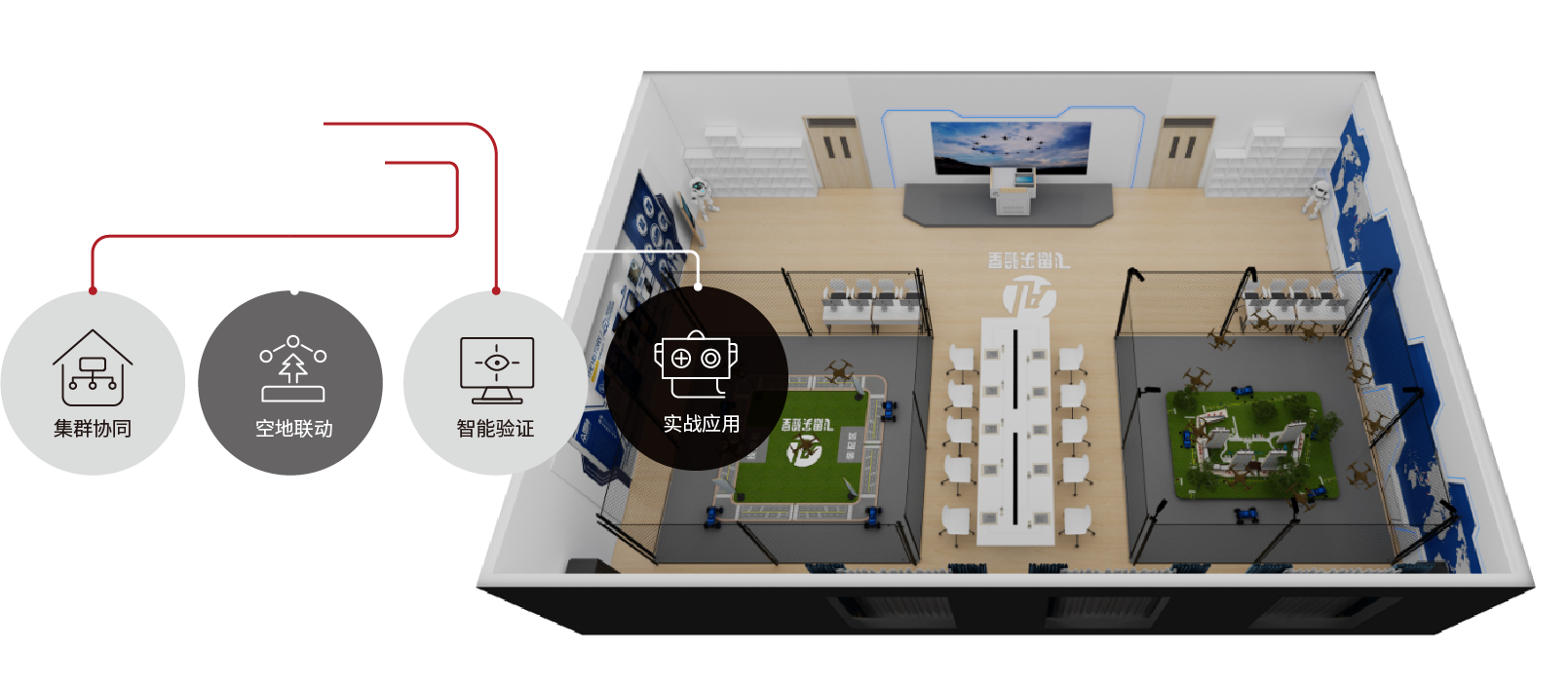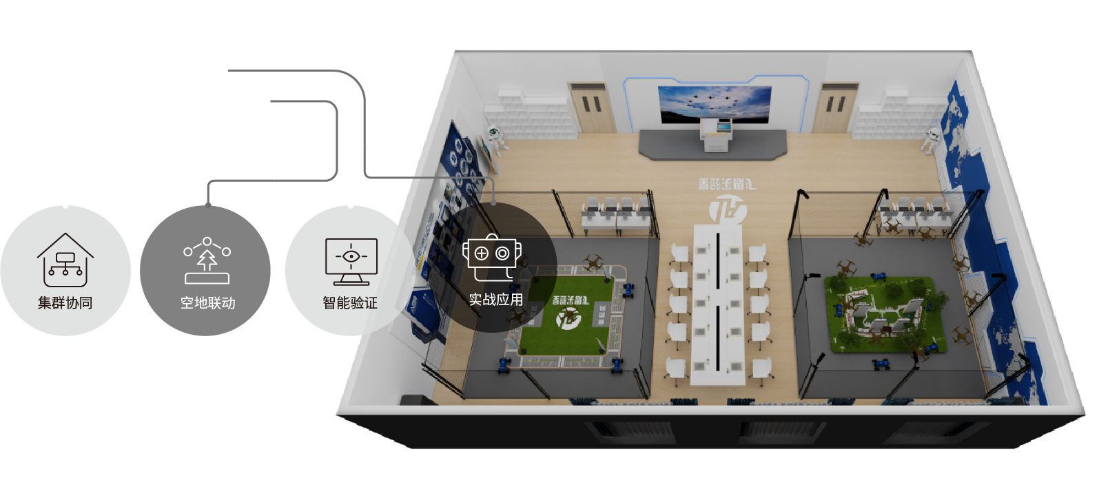 主要应用于无人机等无人系统的多机集群仿真领域。仿真单元集成10套工业级自驾仪、网络交换、继电器等硬件设备,基于飞思RflySim平台构建了Linux+ROS与PX4联动的仿真环境,在仿真计算机上部署RflySim平台后,在RflySim3D中提供城市、山区等各类集群飞行环境,从而实现丰富的多机集群仿真。
